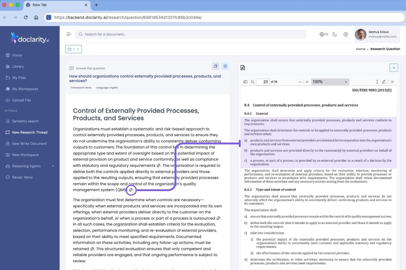 Doclarity.ai is a multi-tenant platform that turns your organization’s curated documents into a searchable, secure knowledge base with semantic search, citation-backed Q&A, and AI-assisted writing.