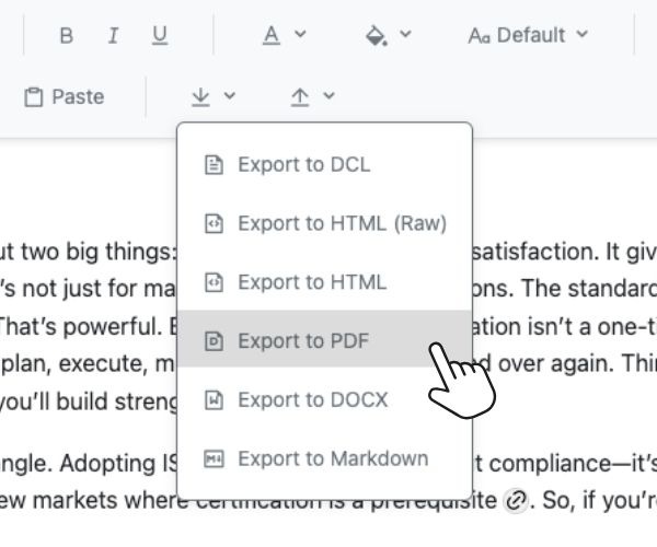 - Generate structured outputs (briefs, FAQs, executive summaries, more) in a WYSIWYG editor—then export to DOCX/PDF/Markdown.
